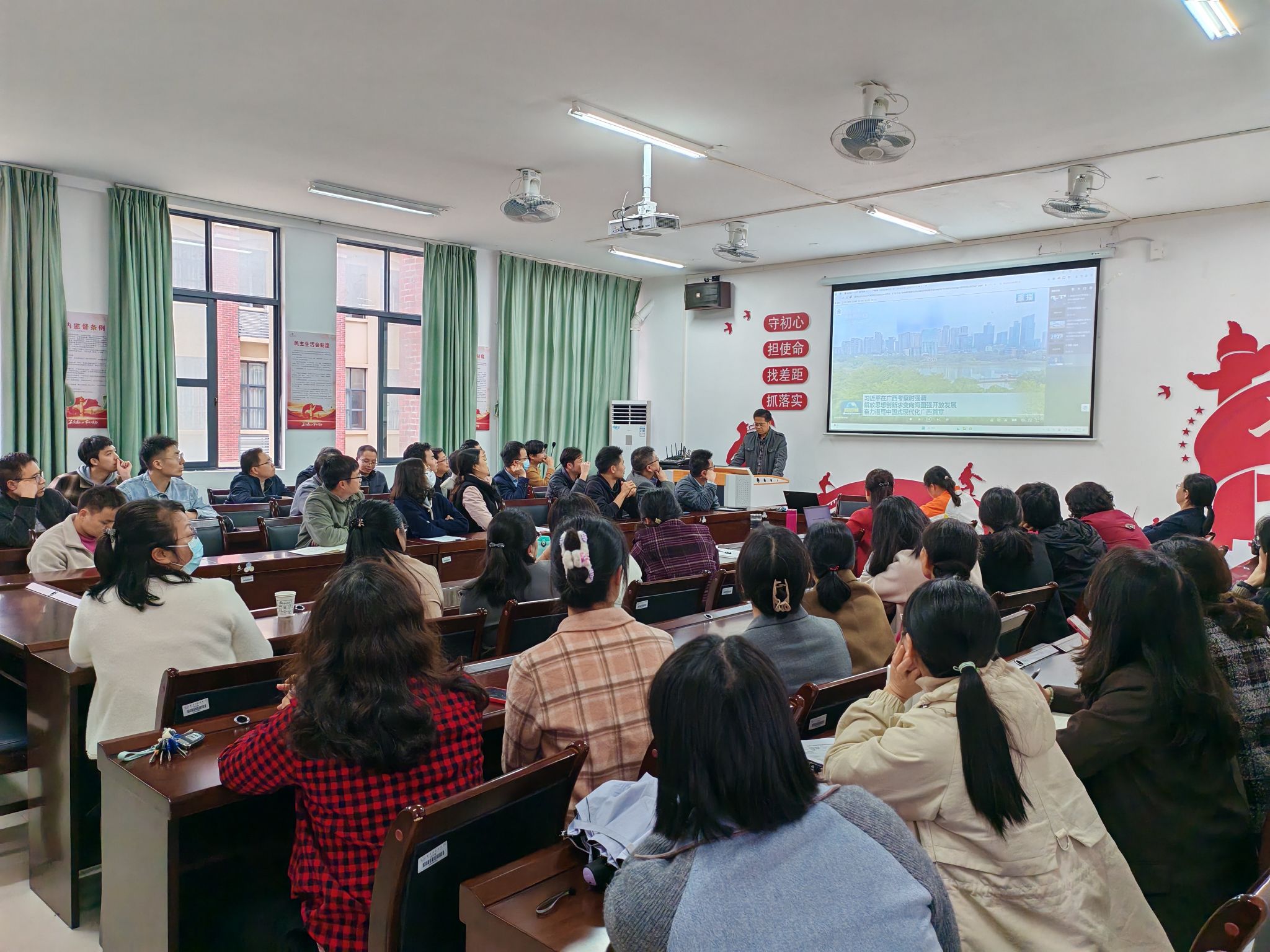 会上,全体教职工认真观看了习近平总书记视察广西时的新闻联播,深刻领悟习近平总书记视察广西时的重要讲话精神,边学习边交流。