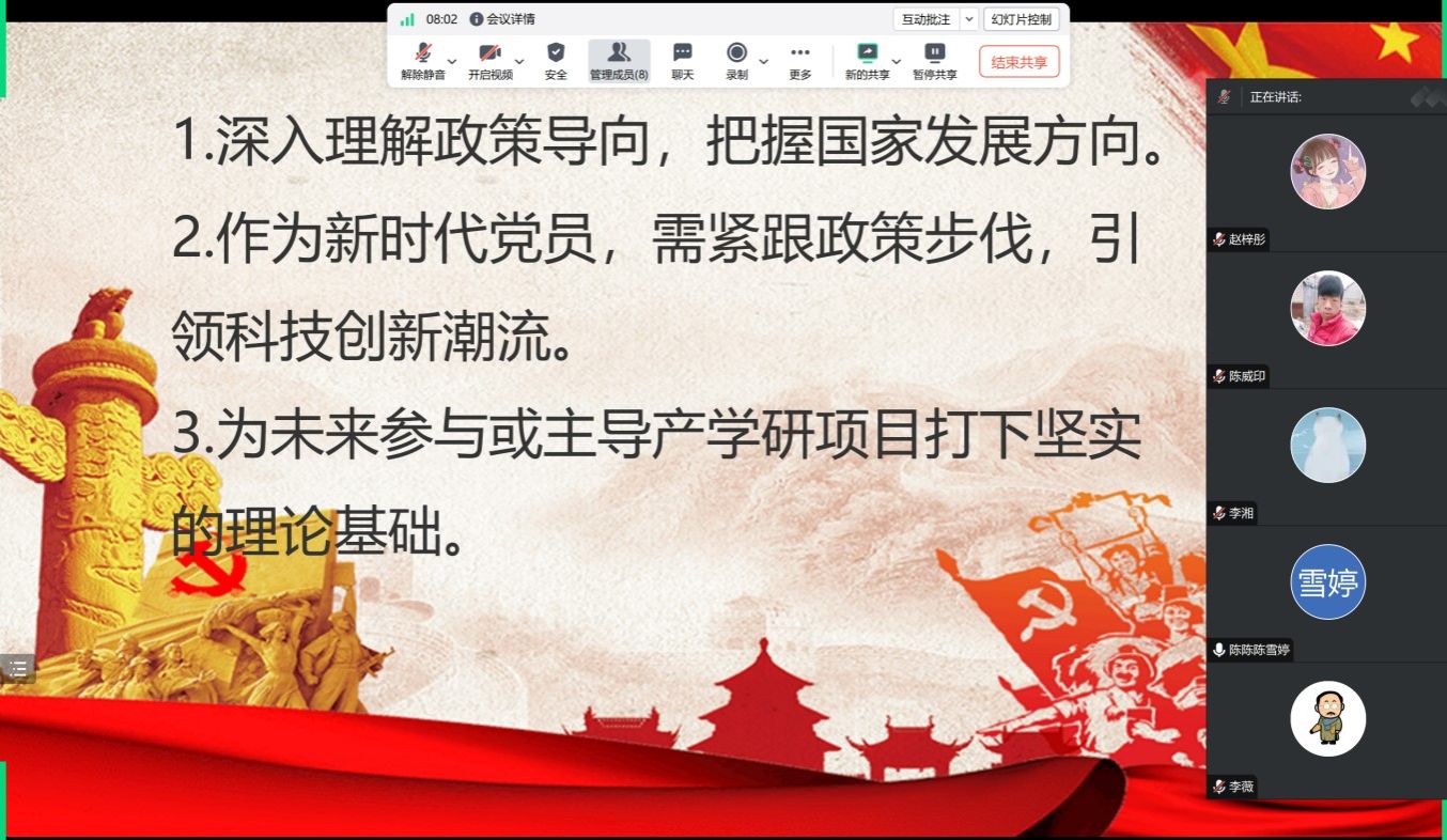 为深入学习贯彻习近平新时代中国特色社会主义思想,践行党的二十届三中全会精神,2025326日,22化本2班党小组在腾讯会议线上开展了“践行党的二十届三中全会精神,推动产学研深度融合创新发展”主题党课。本次党课由22化本2班党小组陈雪婷同志主持,全体党员参与其中。